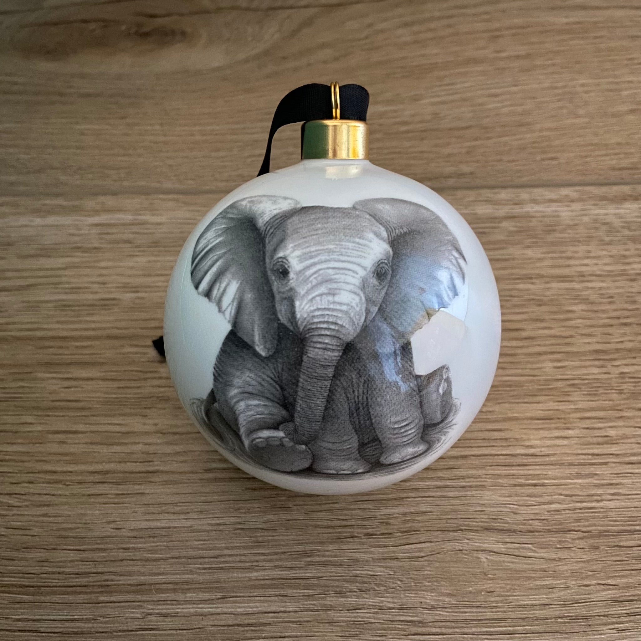 Beautiful & festive white Fine Bone China bauble with printed original pencil art character.