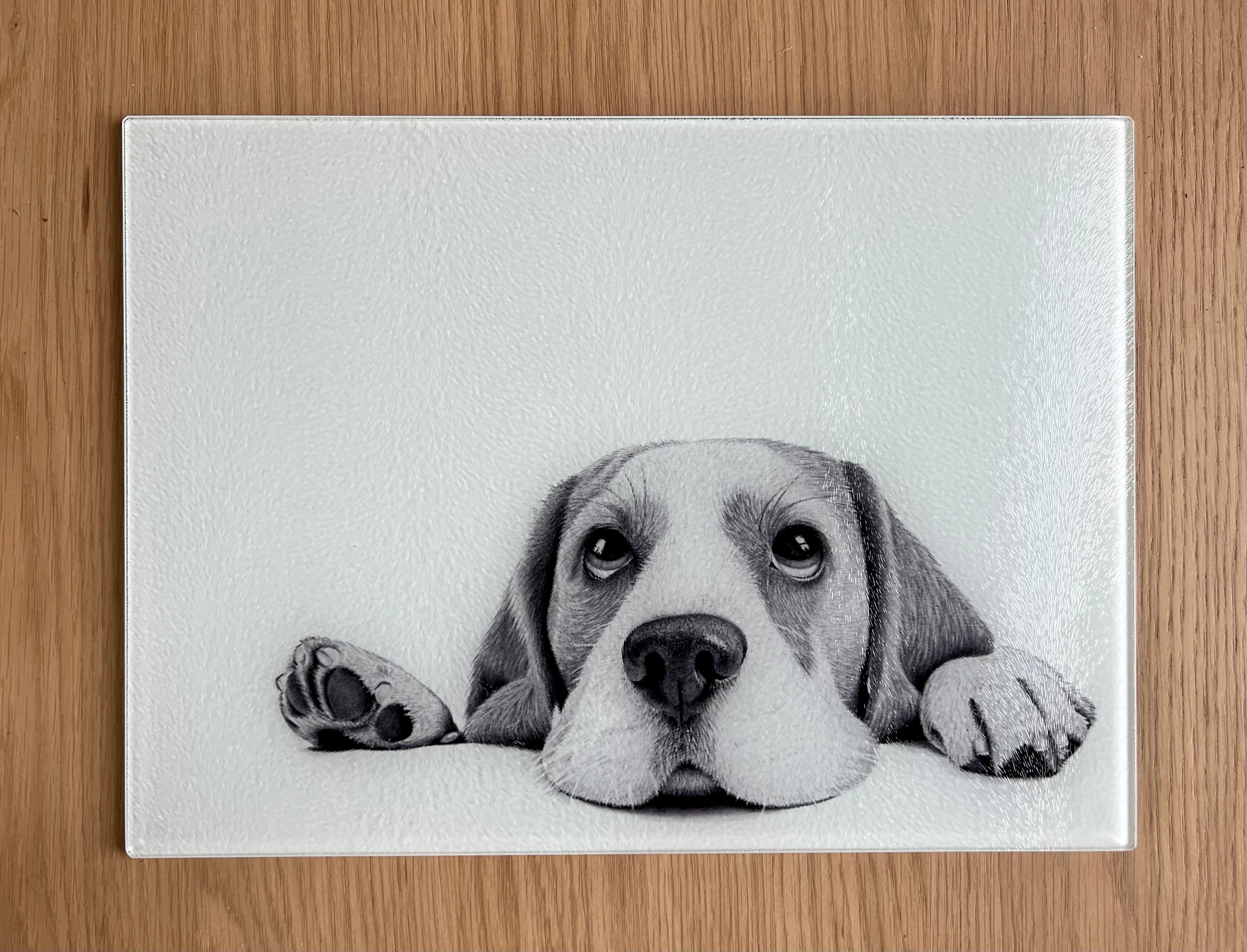 Delightful toughened glass work top saver/chopping board. Designed to make you smile.